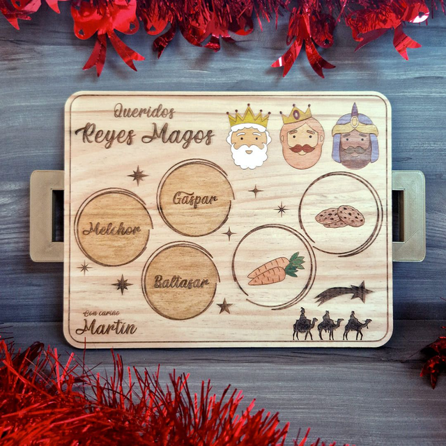 ¡La magia de la Navidad merece un recibimiento especial! Esta encantadora bandeja de madera grabada con los Tres Reyes Magos, está diseñada para que los niños vivan la ilusión de la noche más mágica. Personalizada con su nombre, es el lugar perfecto para dejar galletas para los Reyes y zanahorias para sus camellos. ¡Una tradición que recordarán para siempre!